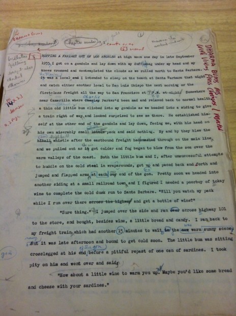 First page of "Dharma Bums." Editor's comments in pencil. Kerouac's comments in red.