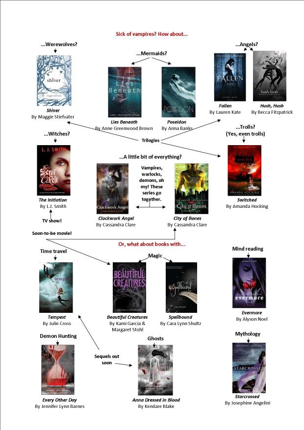 Have you seen the AMAZING chart the Lawrence Public Library made, recommending titles similar to The Hunger Games? I printed a few copies out and put them on our YA display at my library, and they were taken within minutes. It was amazing. So for the past week, I’ve been printing more out, as well as making my own for my library. I have four in the works, but here’s the first…