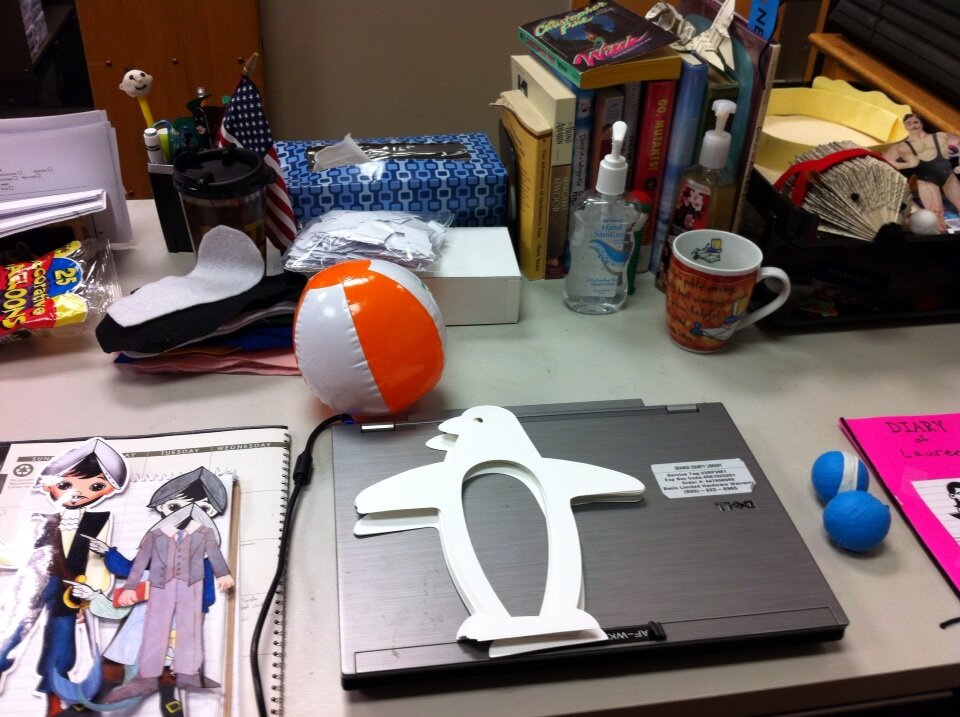 Bottom row – Multiple Flat Ponces**, calendar, laptop, rest of penguin craft, juggling balls (for circus program – made out of balloons and rice), Wimpy Kid diary (also for upcoming program.)