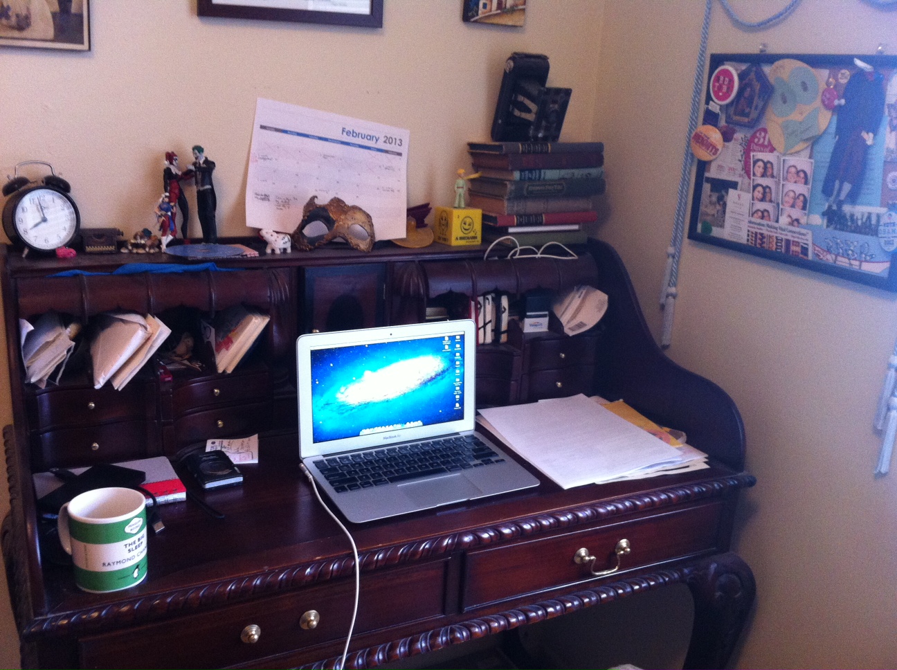 For starters, I love my desk so much. It’s big and bulky and dark wood. Incidentally, I have found two people who share the same desk – one of which being my best friend. It was originally my grandfathers, and he gave it to me before he passed away. There are secret compartments behind the drawers where I like to think he hid presents for my grandmother.