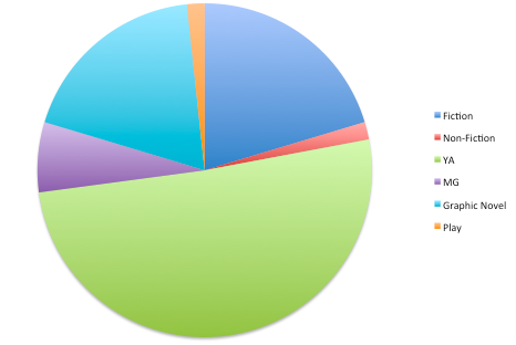 All said, my adult reading was very light this year. Whoops? I wondered what my ratio was, so I’ve decided to make a pie chart for my 2013 reads. Observe!
